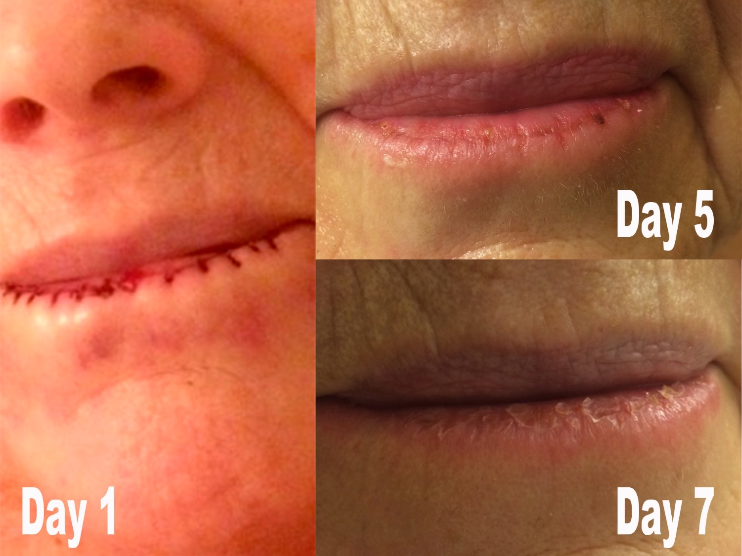 De laesie werd uitgesneden en ze naaiden 12 steken tussen de plooien van de mond.