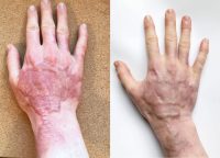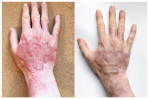 Na 2,5 maand (en nog steeds tellen) van het gebruik van de gel, ervaar ik mijn littekenweefsel als vochtiger, flexibeler, levendiger, sterker en gezonder. Ik gebruik een compressiehandschoen en siliconen pads op mijn rechterhand, waar de huid het meest beschadigd is, en daarom heb ik compressie nodig om de huidtransplantatie te egaliseren, en ik geloof dat de gel helpt om het littekenweefsel flexibeler te maken en beter te kunnen sneller nivelleren onder de compressie.